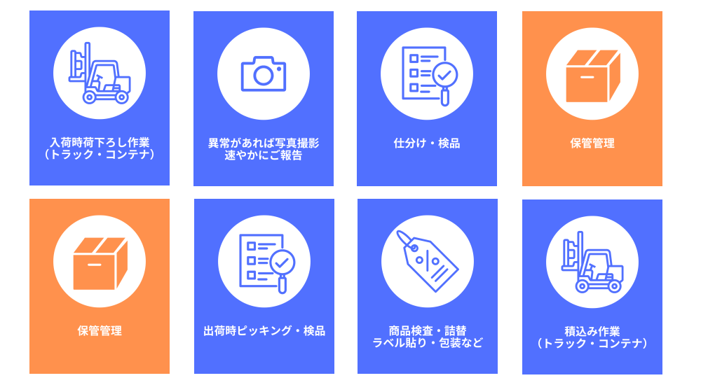 お客様に代わり、ご商品の特性に合わせて倉庫を選定、様々な保管器具を使用し安全にご商品をお預かりします。普通倉庫の他に、定温倉庫・燻蒸倉庫を保有しており、様々なご商品の保管管理が可能です。防犯対策、品質維持のための湿温度計測・害虫予防処置などお客様のご希望のサービスを実施いたします。また万が一に備え、各種賠償責任保険へも加入いたしております。